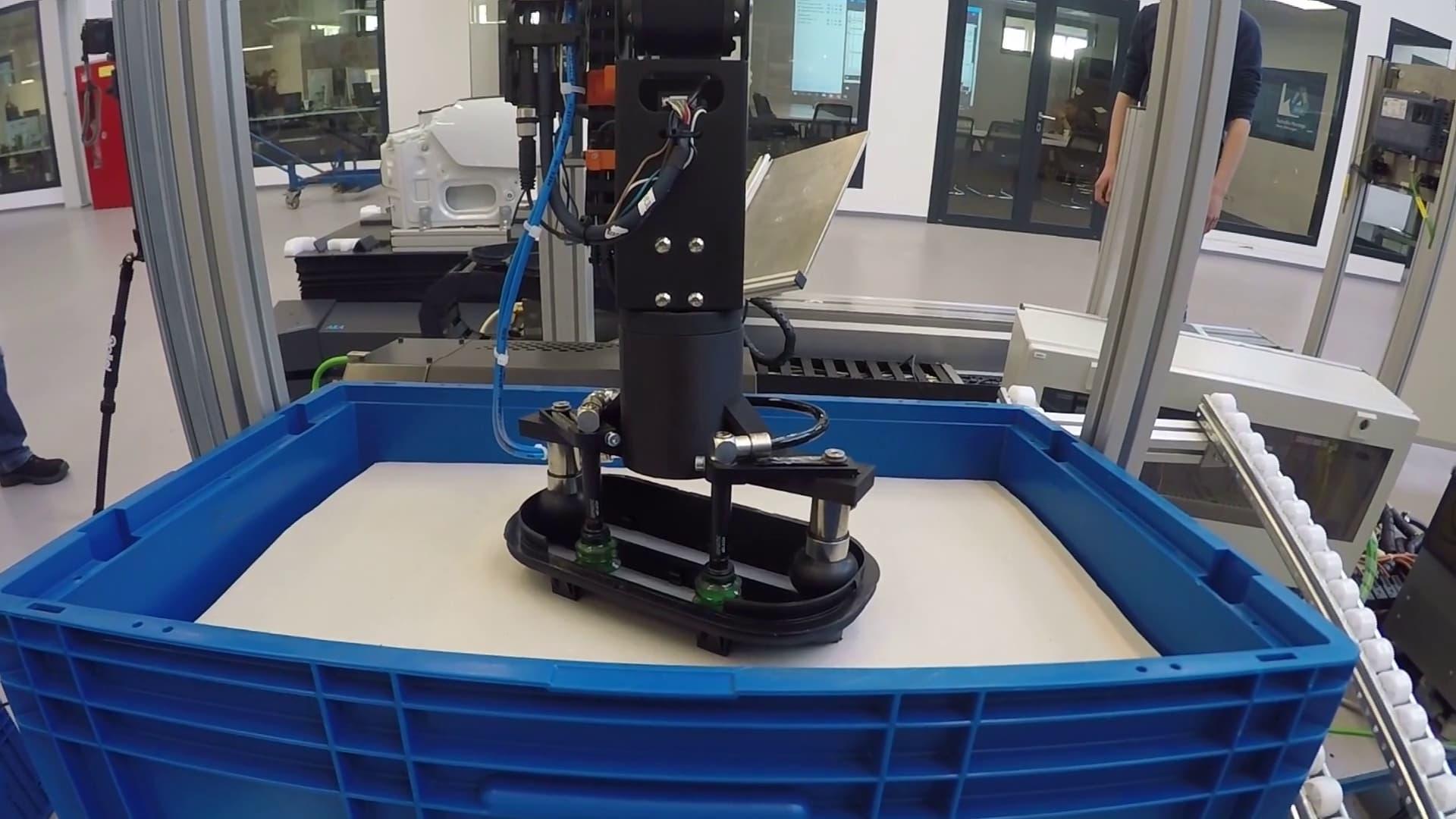 At the Volkswagen plant in Emden, numerous components must be removed from containers for further processing each day. In this project, the focus is on separating forced ventilation frames for the Passat and Arteon models.